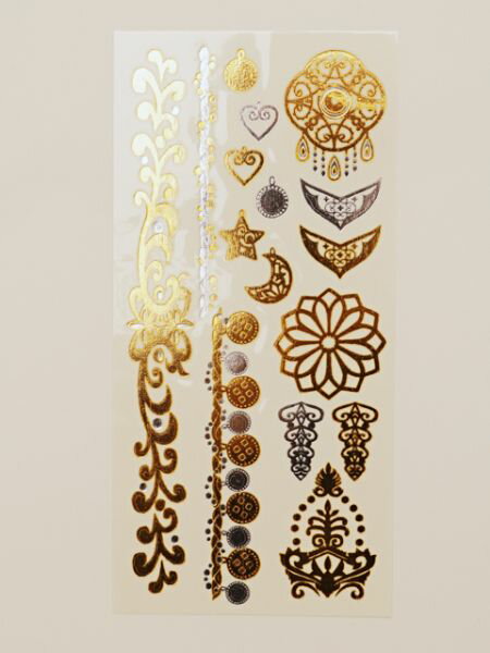 ゴールド&シルバー《付け方簡単◎全18色ジュエリー フラッシュタトゥー》ウォーターシール/水で貼れる/水着/アクセサリー/リゾート/ビーチ/海外セレブ/ロック/パンク/エスニック/羽根/ブレスレット/ネックレス/メール便可//1//