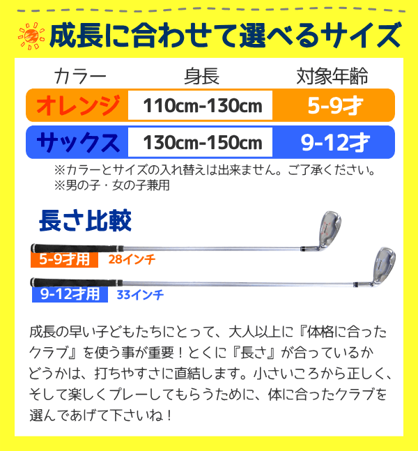 7番アイアン オレンジ(5-9才用) サックス(9-12才用) ロフト(°) 37 長さ(インチ) 28 33 総重量(g) 330 340 ヘッド素材 ステンレス グリップ オリジナルラバーグリップ ヘッドカバー なし ※スペック表数値は参考値となりますので、実際の商品とは多少の誤差が生じる場合がございます